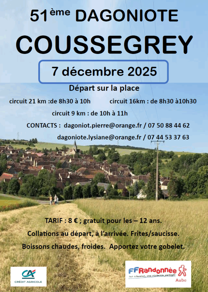 rendez-vous sur la place de Coussegrey : 14h00 le lundi et vendredi
